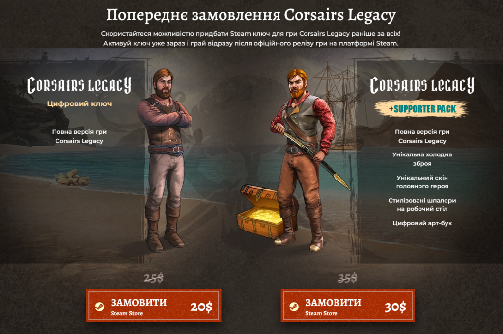 Українська студія Mauris Games відкрили передзамовлення Corsairs Legacy на офіційному стайті гри. Крім звичайного доступне також розширене видання Supporter Pack, що включає унікальну холодну зброю та скін головного героя, стилізовані шпалери для робочого стола та цифровий артбук.