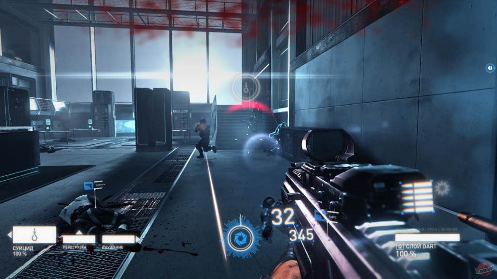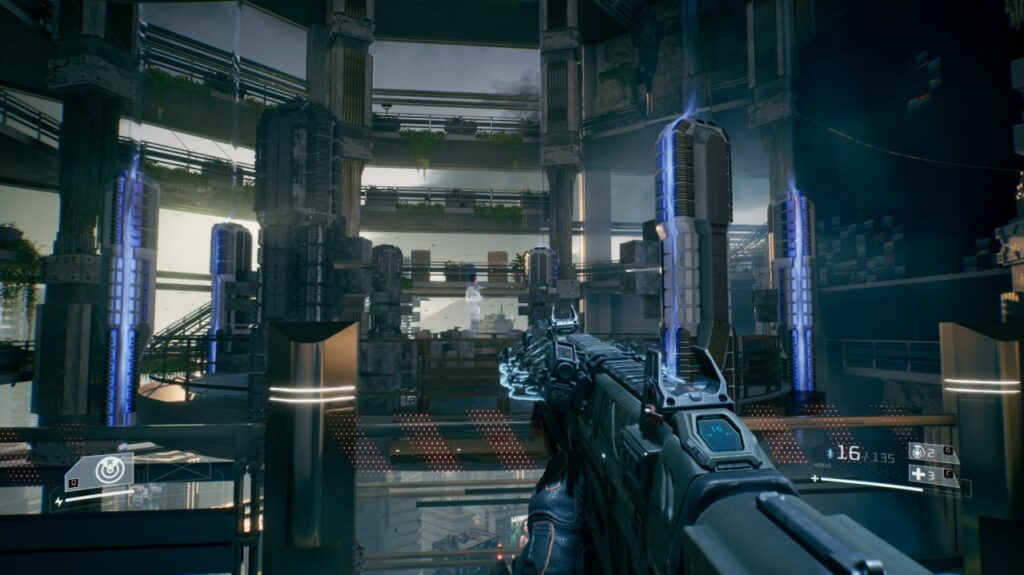 З новою зброєю, з механікою добивань, з швидким та спритним персонажем ми починаємо отримувати той досвід, який так чекали отримати від стрілянки про кіберпанк. В цей момент гра піднялась у моїх очах одразу на кілька пунктів. Хмарочос, по якому ми пересуваємось – доволі дженеріковий, як для кіберпанк-гри, але, чимось, все ж, чіпляє. Зброя в наших руках теж, ну, наче, звичайна, але як же смачно стріляє, як перезаряджається.