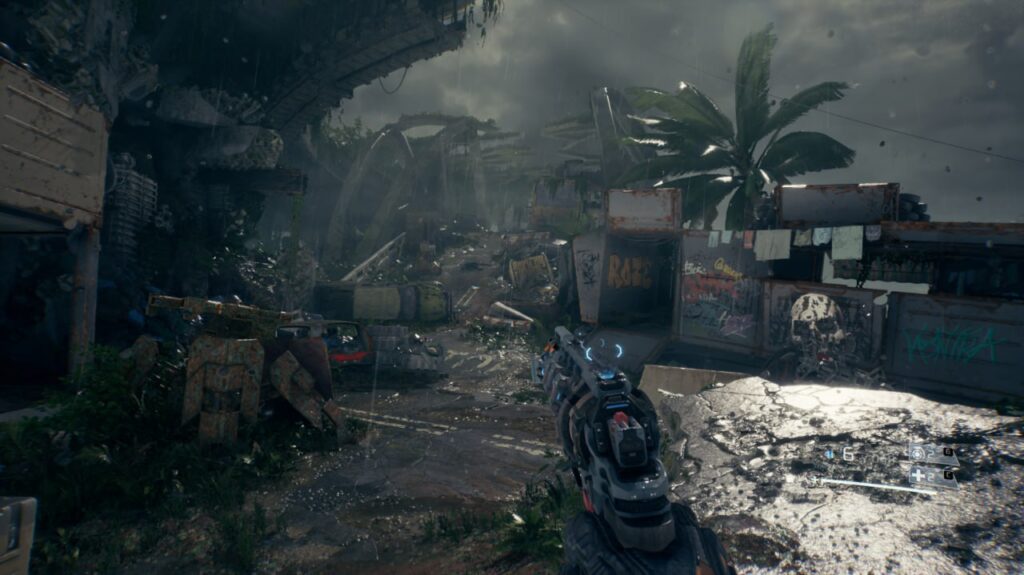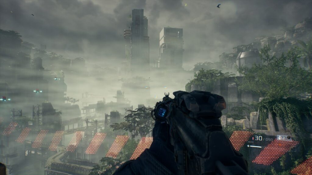 Тут я розповім тільки про першу місію і трохи про другу, бо гра настільки коротка, що навіть таким описом прологу я вже можу випадково розказати про 50% наративу. В першій місії ми проходимо тренінг і нас закидують на руїни. Все виглядає сірим та засвіченим. Ніяким, що у діалоговому, що у режисерському планах. Єдине, що могло б врятувати цей сегмент – це якісний підхід до перестрілок і левел-дизайну. Але ж тут ми вже одразу впираємось у проблему. Попри якісну механіку стрільби, дизайн рівня на першій локації – це “привіт” з 2010 року. І, в даному випадку – це не та ностальгія, яку хотілося б отримати. Аби мати функцію, себто, укриття та секції для платформінгу, розробники принесли у жертву логіку і естетичність локації. Все одноманітне, сіре бетонне “ніщо”, по якому герой пересувається без належної мотивації. Все, що є – це голос у рації, який повторює, що треба зробити гравцю, заважаючи експлорінгу та діючи на нерви.